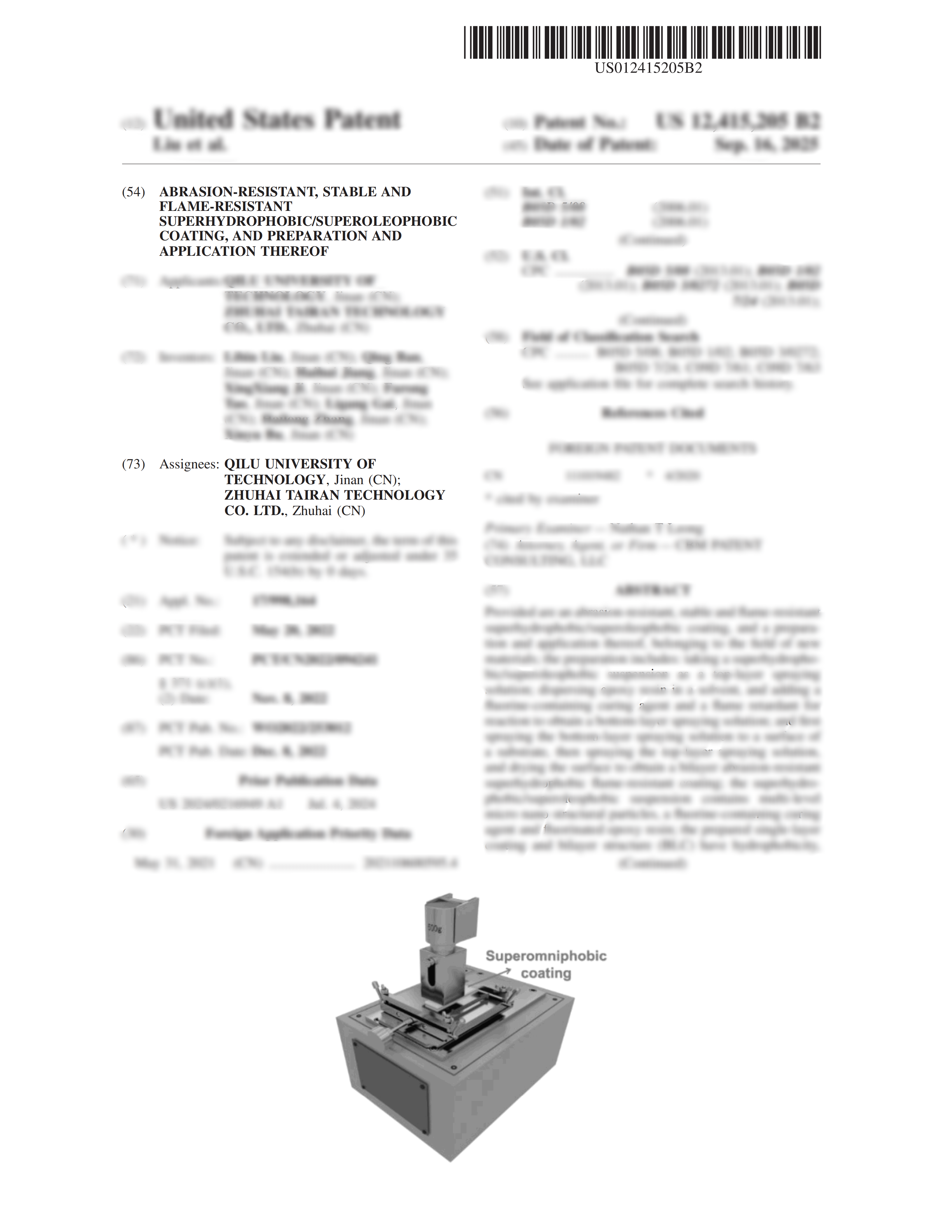 近日,珠海钛然科技有限公司与齐鲁工业大学(山东省科学院)联合申报的一项技术成果获得美国专利及商标局(USPTO)授予的专利权(专利号:US12,415,205B2)。美国专利及商标局(USPTO)是全球知识产权保护领域最具权威性的机构之一,获其专利权授予,可视为该专利技术具有国际一流的科研水平,并在新颖性、创造性和实用性方面具有突出的国际应用和保护价值。此实为钛然科技迈向全球化的坚实一步。